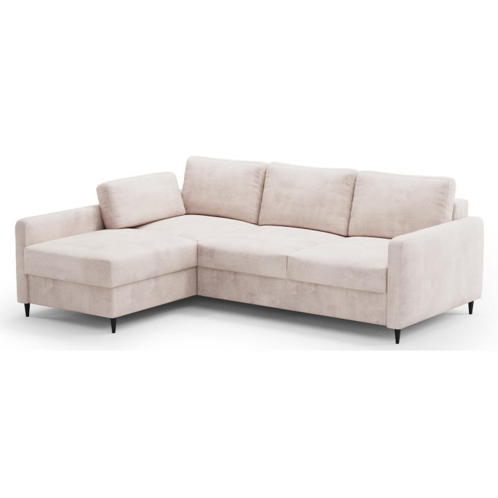 W siedzisku zastosowano sprężynę falistą i piankę poliuretanową, co zapewnia odpowiednią elastyczność i wygodę podczas siedzenia. Oparcie również wypełnione jest pianką, a w zestawie znajduje się dodatkowa poduszka, która wspiera codzienny relaks. Narożnik osadzony jest na wysokich czarnych nóżkach, które podkreślają jego nowoczesny wygląd i ułatwiają utrzymanie porządku pod meblem.