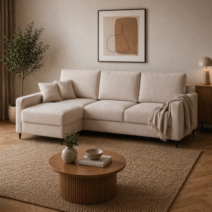 Narożnik Galeo marki MP Nidzica to nowoczesny mebel dostępny wyłącznie w naszym sklepie. Model w kształcie litery L sprawdzi się idealnie w średnich i mniejszych salonach, łącząc komfort codziennego wypoczynku z praktycznymi funkcjami. Narożnik wyposażony jest w funkcję spania typu delfin, dzięki której łatwo zamienisz go w wygodne miejsce do snu o pełnowymiarowej powierzchni. W otomanie znajduje się pojemnik na pościel, idealny do przechowywania koca, poduszek lub zapasowej kołdry.