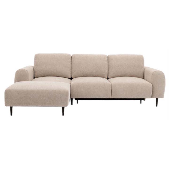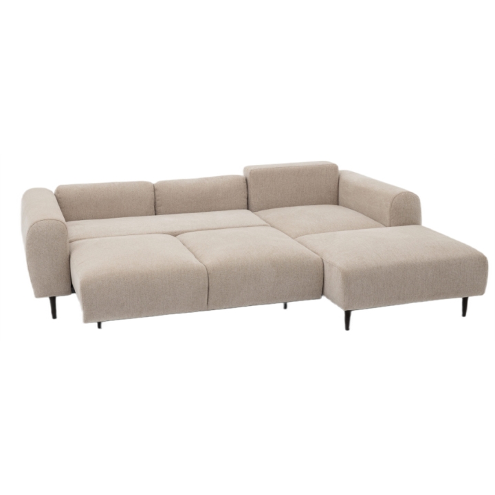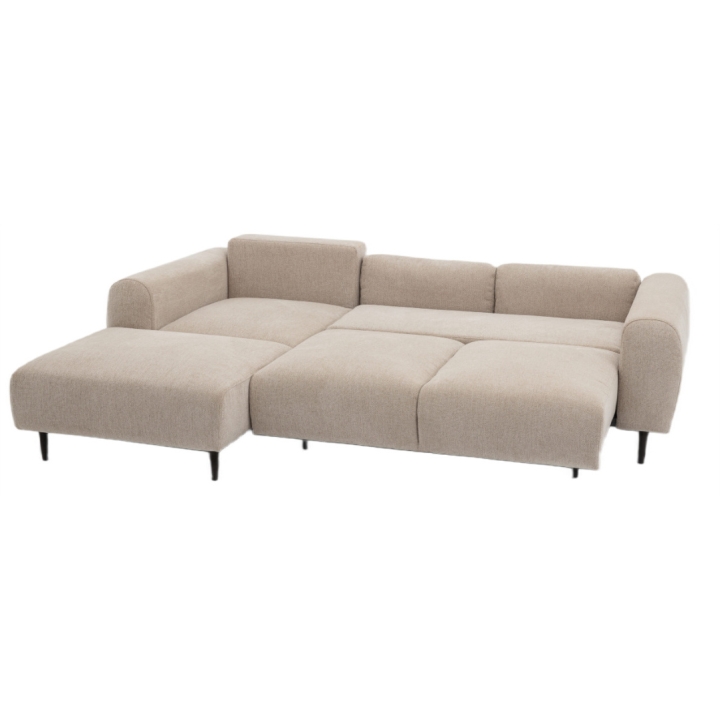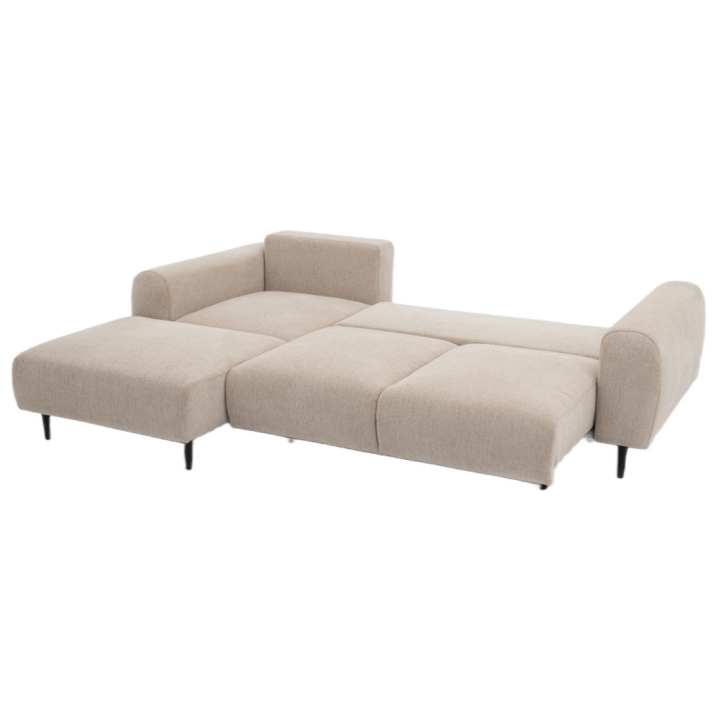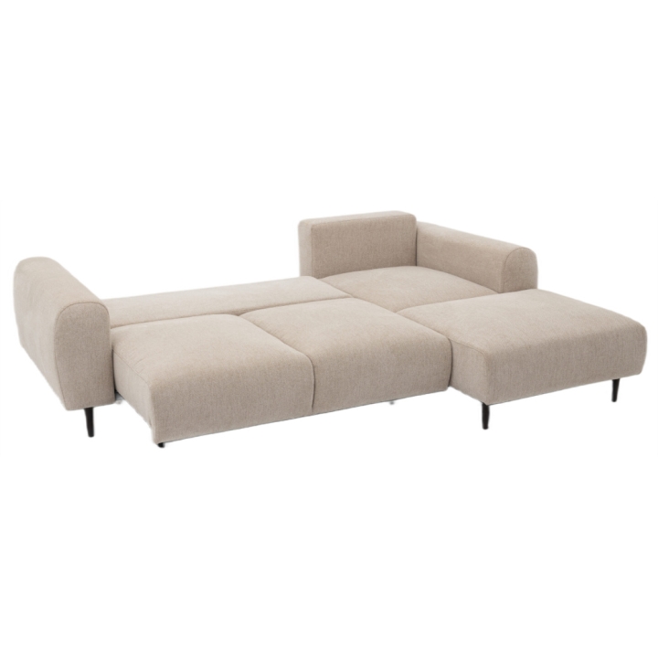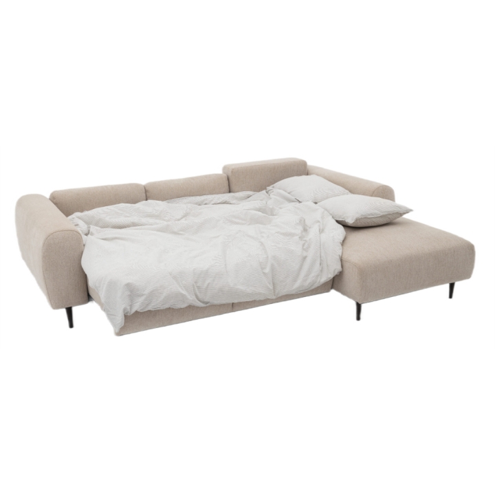 Dodatkowym atutem jest funkcja spania typu DL, w której siedzisko wysuwa się ku przodowi, a oparcie składa, tworząc powierzchnię spania 130×200 cm. Mechanizm pozwolił na zastosowanie przestronnego pojemnika na pościel ukrytego pod rozkładanym modułem. Rozwiązanie to zwiększa użyteczność narożnika, czyniąc go wszechstronnym elementem wyposażenia