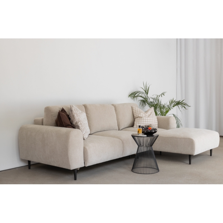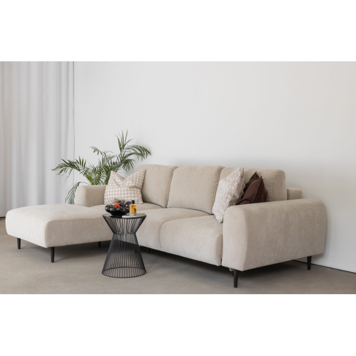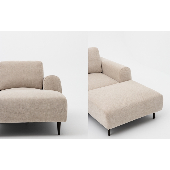 Miękkie poduchy oraz ergonomicznie ukształtowane siedzisko zapewniają znakomity komfort odpoczynku. Zaokrąglone podłokietniki wprowadzają do wnętrza wrażenie przytulności, podkreślając łagodny profil narożnika. Całość tworzy miejsce sprzyjające długim chwilom relaksu.