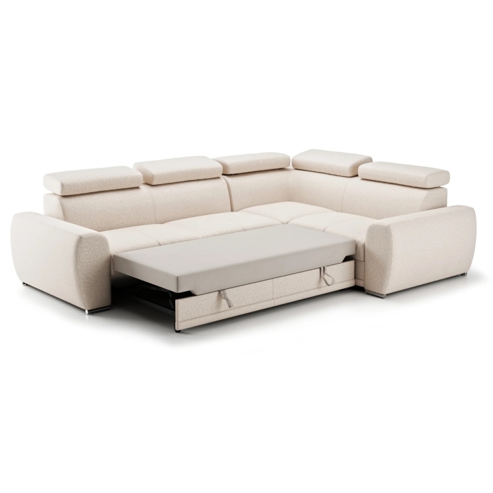 Dodatkowym atutem modelu jest funkcja spania typu delfin, która pozwala szybko przekształcić narożnik w łóżko o powierzchni 205x130 cm. Mechanizm polega na wysunięciu dolnej szuflady spod siedziska i podniesieniu materaca, co pozwala uzyskać jednolitą przestrzeń do snu. Stabilność konstrukcji oraz wygodę w codziennym użytkowaniu zapewnia zastosowanie w siedzisku i oparciu profilowanej sprężyny falistej w połączeniu z pianką poliuretanową.