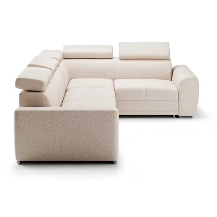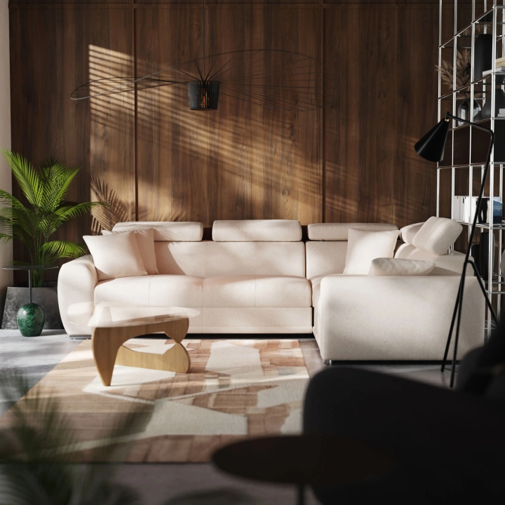 Mebel wyposażono w pięć regulowanych zagłówków, których ustawienie można precyzyjnie dopasować do potrzeb chwili. Dzięki kilkustopniowemu mechanizmowi, oparcie głowy i karku zyskuje dodatkowe podparcie, co przekłada się na wyższy komfort użytkowania podczas odpoczynku. Takie rozwiązanie pozwala również na płynne dopasowanie narożnika do różnych sposobów spędzania czasu – od relaksu z książką po rozmowy z bliskimi.