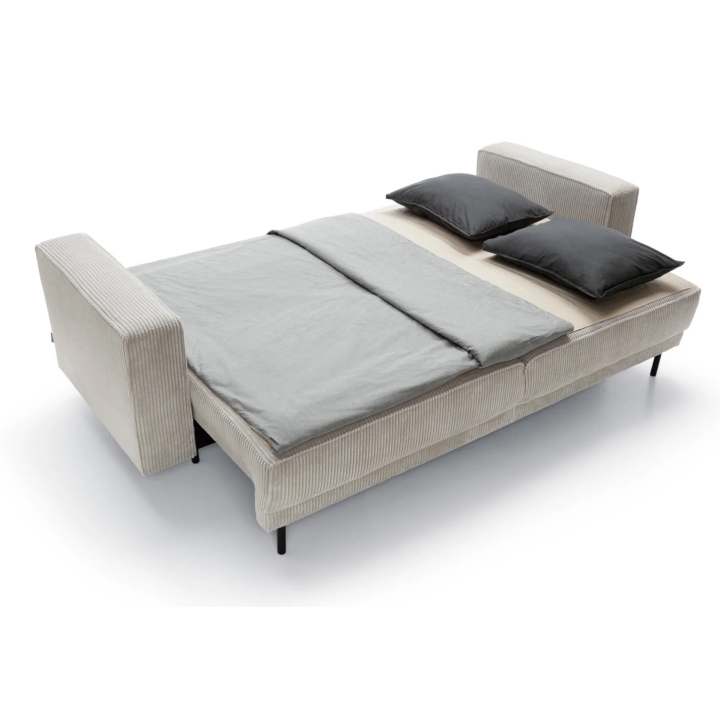 Dodatkowym atutem modelu Modo jest obecność pojemnika na pościel, ukrytego w dolnej części konstrukcji. Rozwiązanie to pozwala przechowywać koce lub zestawy tekstyliów bez konieczności zajmowania przestrzeni w szafach. Dyskretnie wkomponowany schowek pozostaje niewidoczny dla oka, zachowując spójną estetykę bryły.
