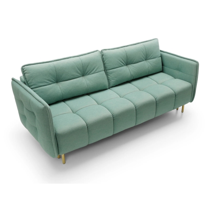 Uwagę zwracają dopracowane detale, w tym estetyczne przeszycia na siedzisku, oparciach i bokach, które nadają całości charakteru. Sofę osadzono na smukłych, złotych nogach wykonanych z metalu, które kontrastują z kolorem tkaniny, wprowadzając do wnętrza subtelny akcent wizualny. Wysokie nóżki wpływają także na komfort sprzątania przestrzeni pod meblem i potęgują wrażenie lekkości konstrukcji.