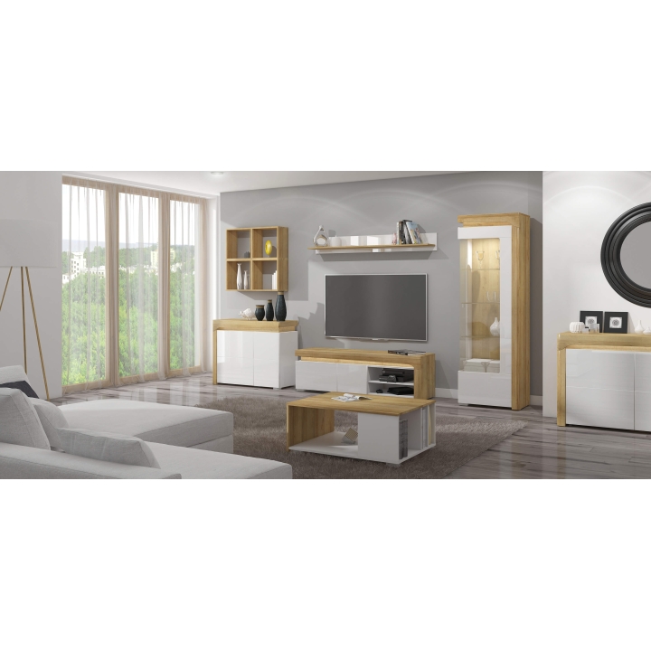 Model można rozszerzyć o LED NEO-8C w ciepłej bieli montowany w górnym wieńcu – światło delikatnie podkreśla linię mebla i wprowadza nastrojowy klimat. THK-3 dostarczana jest w trzech paczkach, co ułatwia wniesienie i samodzielne złożenie. To dobry wybór, jeśli zależy Ci na pojemnym i uporządkowanym układzie przechowywania.