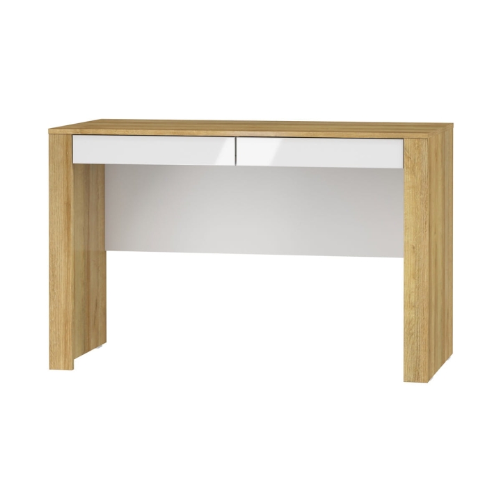Korpus w wybarwieniu Dąb Riviera połączono z białym frontem MDF w połysku. Gładkie powierzchnie bez uchwytów ułatwiają korzystanie z szuflad i nadają całości nowoczesny charakter. Biurko dostarczane jest w dwóch paczkach, co ułatwia transport i montaż w każdym pomieszczeniu. THB-1 dobrze sprawdzi się w domowym biurze, pokoju młodzieżowym lub strefie pracy w salonie.