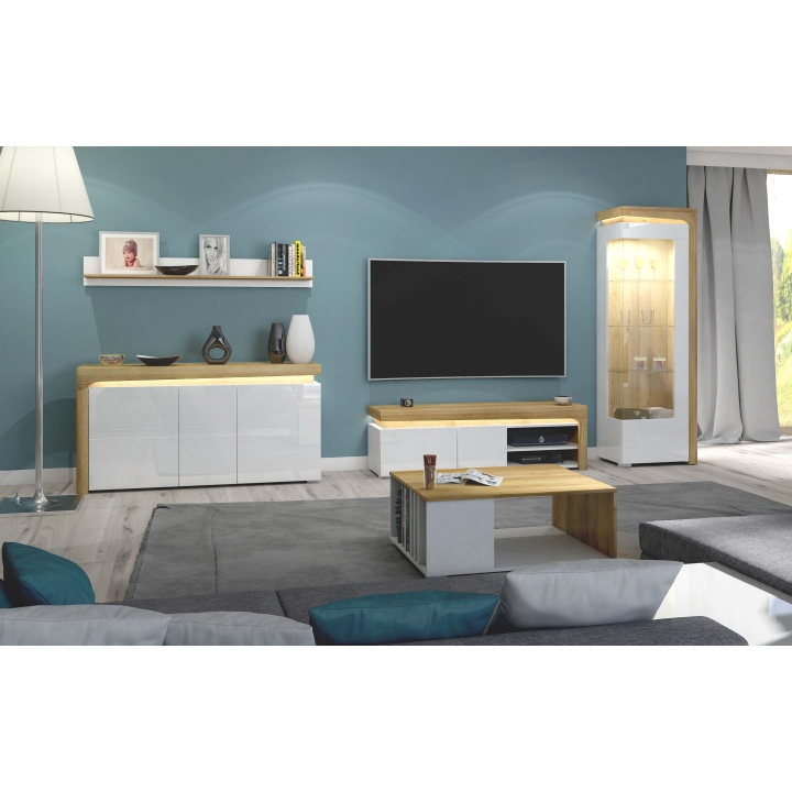 Metalowy uchwyt w kolorze chrom mat dodaje wyrazistego akcentu i ułatwia otwieranie. Element można rozszerzyć o oświetlenie LED NEO-9 w ciepłej bieli, montowane zarówno w górnym wieńcu, jak i wewnątrz witryny — światło podkreśla zawartość i nadaje jej bardziej wyeksponowany charakter. Model dostarczany jest w trzech paczkach, co ułatwia transport do mieszkania.