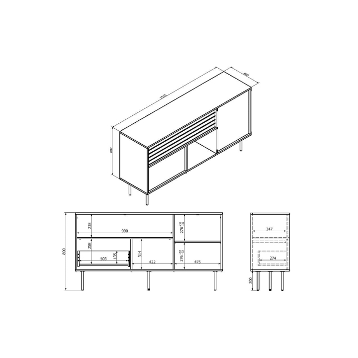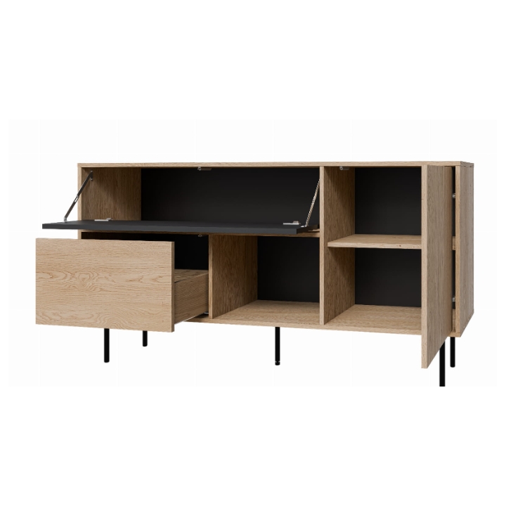 Komoda ARD-KO150 łączy zamkniętą część frontową z otwartą przestrzenią, dzięki czemu łatwo rozdzielisz rzeczy, które chcesz mieć pod ręką, od tych wymagających ukrycia. Korpus w odcieniu Dąb Cremona wykonano z matowej płyty laminowanej, a front z czarnego MDF pokrytego folią PVC oraz elementów z tej samej płyty co korpus. Całość opiera się na czarnych nóżkach nadających meblowi lekką, stabilną podstawę.