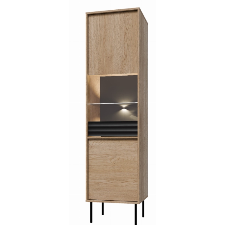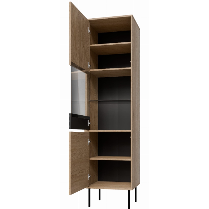 Matowy czarny front został wyraźnie frezowany, co tworzy efekt głębi i mocny akcent wizualny. Drzwi wyposażono w zawiasy z cichym domykiem, dzięki czemu zamykają się płynnie i bez hałasu. Opcjonalne oświetlenie NEO-17 w ciepłej bieli pozwala doświetlić wnętrze witryny i podkreślić jej zawartość. Mebel dostarczany jest w trzech paczkach, co ułatwia transport i montaż.