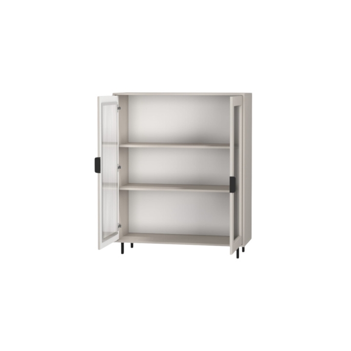 Witryna składa się z części dwudrzwiowej. Wewnątrz znajdują się dwie półki wykonane z płyty laminowanej, zapewniające przestrzeń do ekspozycji przedmiotów. Drzwi witryny wyposażono w szkło hartowane o wzorze ryflowanym, które nadaje meblowi ciekawego charakteru.