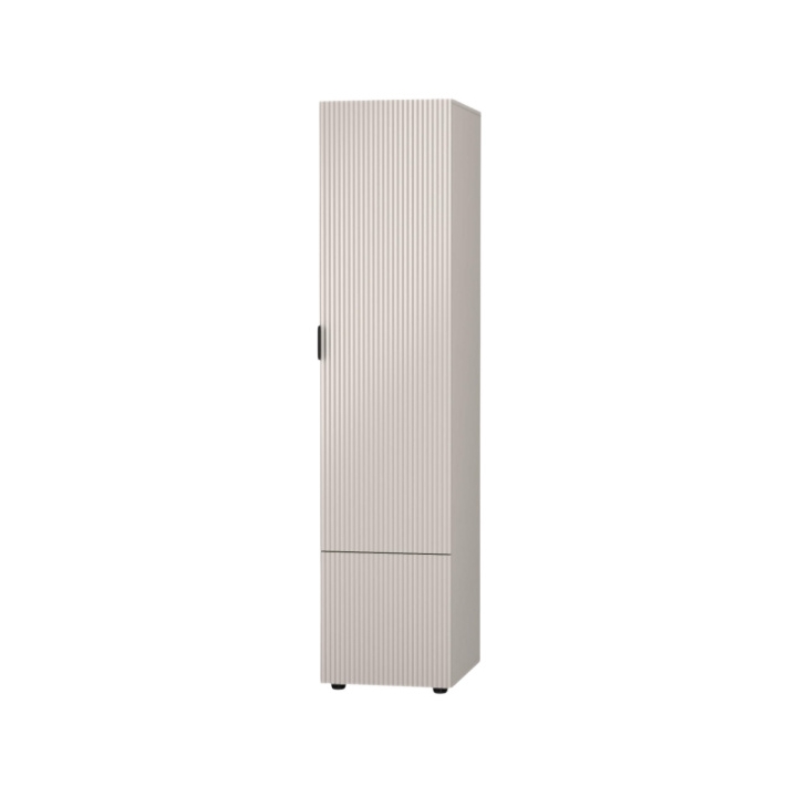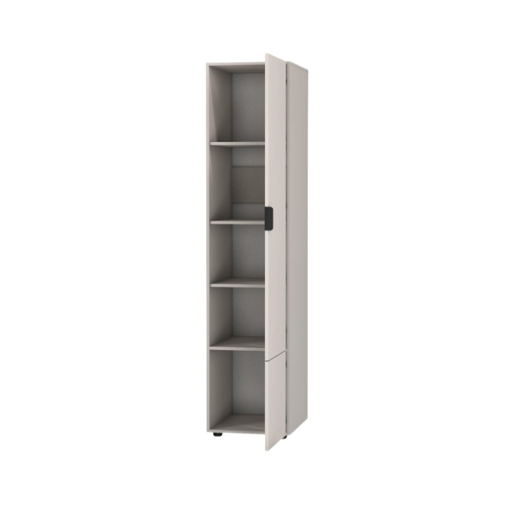 Główna część mebla jest jednodrzwiowa i skrywa cztery półki, które zapewniają wygodne miejsce na odzież składaną. Poniżej znajduje się mała szafka za pełnym frontem, idealna do przechowywania dodatkowych przedmiotów. Korpus wykonano z matowej płyty laminowanej.