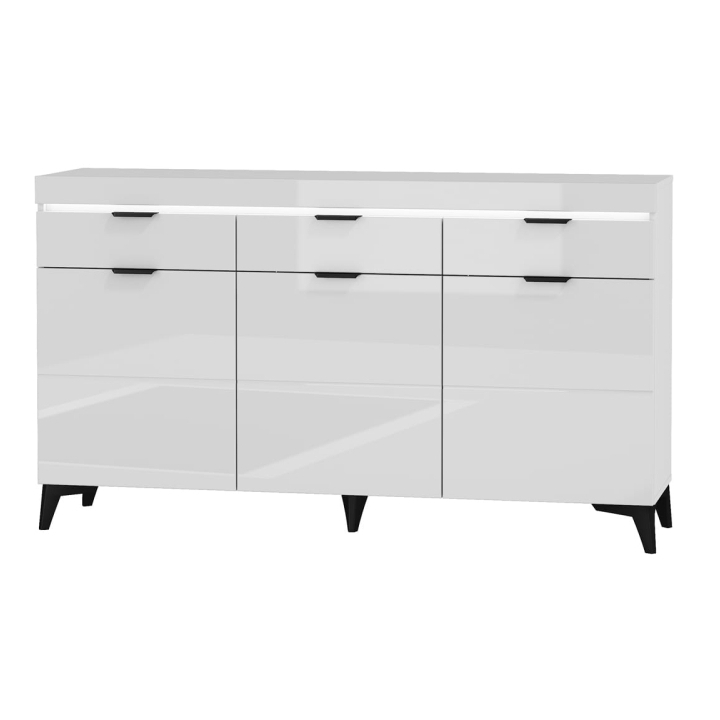 Korpus mebla wykonano z matowej płyty laminowanej. Fronty wykonano z płyty MDF oklejonej folią PVC w wysokim połysku, co nadaje komodzie charakterystyczny wygląd. Mebel wyposażono w czarne metalowe uchwyty w wykończeniu matowym oraz ustawiono na czarnych nóżkach z wytrzymałego tworzywa.