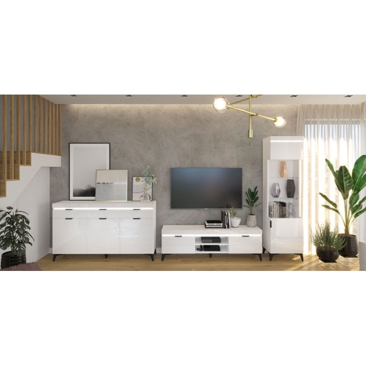Mebel wyposażono w czarne metalowe uchwyty w wykończeniu matowym oraz ustawiono na czarnych nóżkach z wytrzymałego tworzywa. Zawiasy drzwi mają mechanizm cichego domyku, co zapewnia płynne i bezgłośne zamykanie.