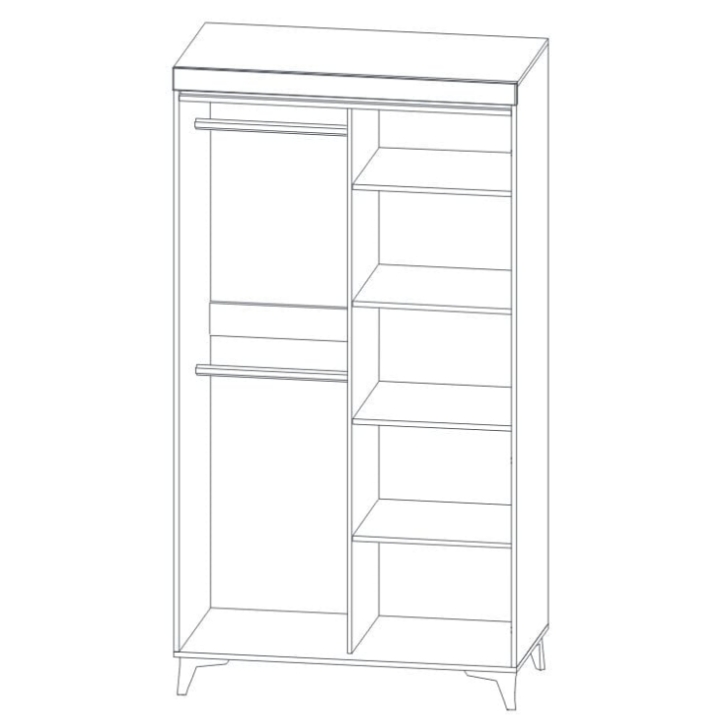 Wnętrze szafy podzielono na dwie strefy. W jednej części znajdują się cztery półki bieliźniarki przeznaczone na odzież składaną. W drugiej części umieszczono dwa drążki, które służą do wieszania koszul, kurtek i sukienek.