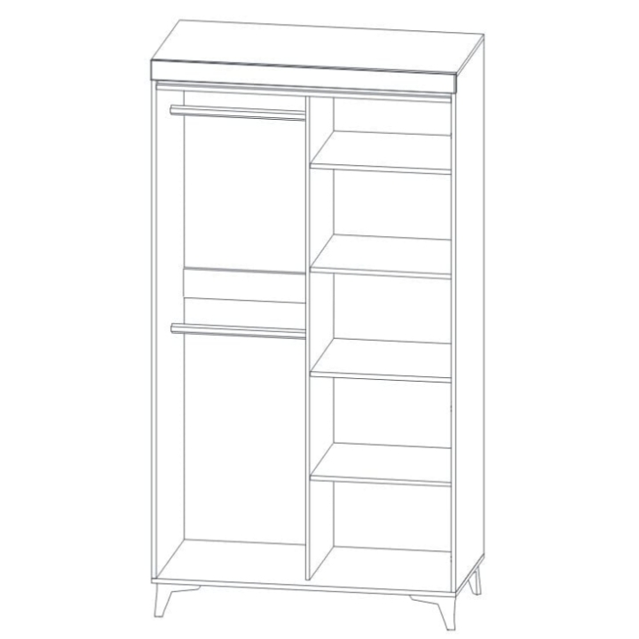 Konstrukcja szafy składa się z dwóch części. W jednej części szafy znajdują się cztery półki bieliźniarki, przeznaczone na odzież składaną i dodatki. W drugiej części umieszczono dwa drążki do wieszania ubrań, które wymagają przechowywania na wieszakach.