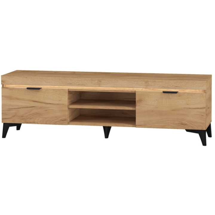 Szafka składa się z trzech sekcji. Sekcja środkowa jest otwarta i zawiera półkę z regulowaną wysokością mocowania, która jest idealna na dekoder lub sprzęt audio. Po bokach znajdują się zamykane szafki, co umożliwia wygodną organizację przestrzeni multimedialnej.