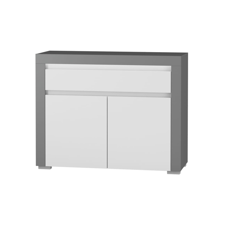 Komoda składa się z części dwudrzwiowej, wewnątrz której znajdują się praktyczne półki, ułatwiające organizację. Korpus mebla wykonany jest z matowej płyty laminowanej o zwiększonej odporności na zarysowania, co podnosi trwałość mebla.