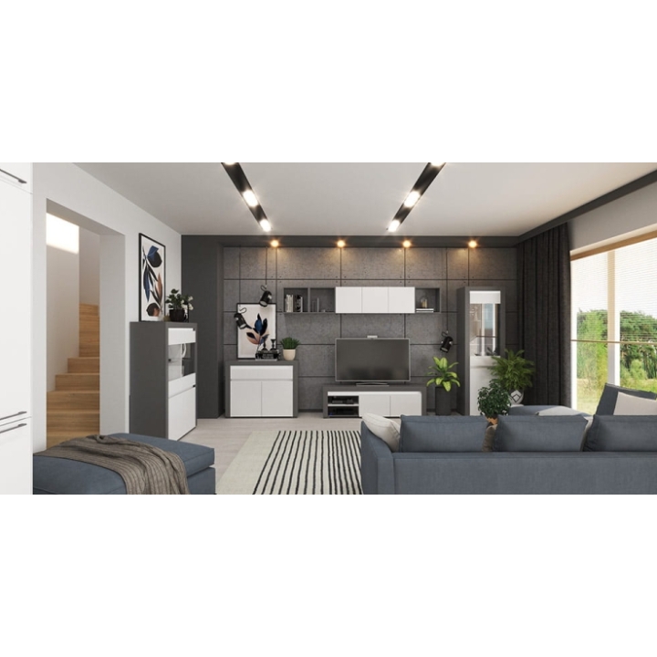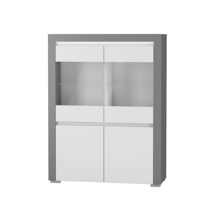 Witryna Alabama ABW-1 producenta Restol to nowoczesna witryna o szerokości 106 cm, głębokości 39 cm oraz wysokości 139,3 cm. Jest to szeroka witryna idealna do salonu. Łączy w sobie białe matowe fronty z antracytowymi akcentami.