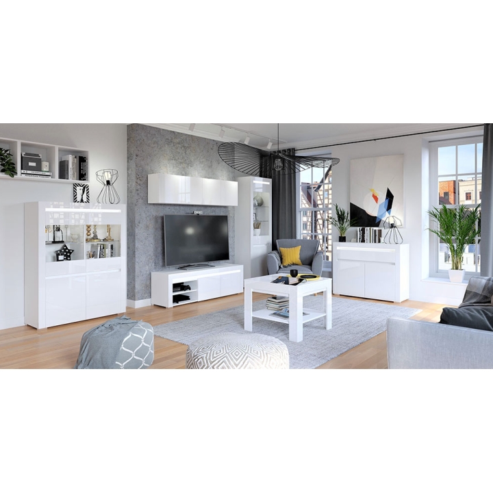 Korpus mebla wykonany jest z matowej płyty laminowanej, natomiast fronty z połyskowej płyty laminowanej. We frontach zastosowano podchwyty ułatwiające otwieranie, co podkreśla minimalistyczny styl mebla.