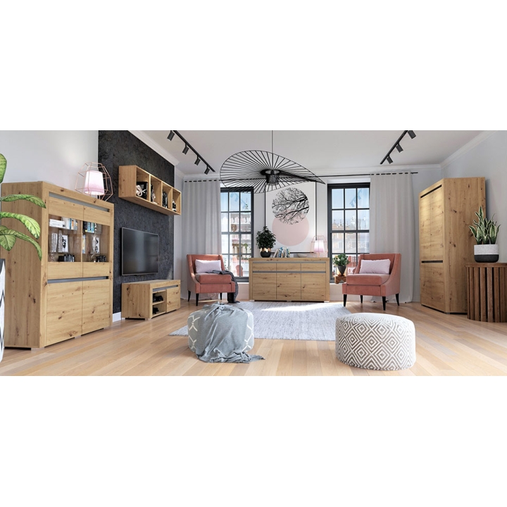 Mebel wykonany jest z płyty laminowanej w naturalnej kolorystyce Dąb Artisan. To jasne, naturalne wybarwienie sprawdza się w różnych aranżacjach i stanowi ponadczasowe uzupełnienie wnętrza.