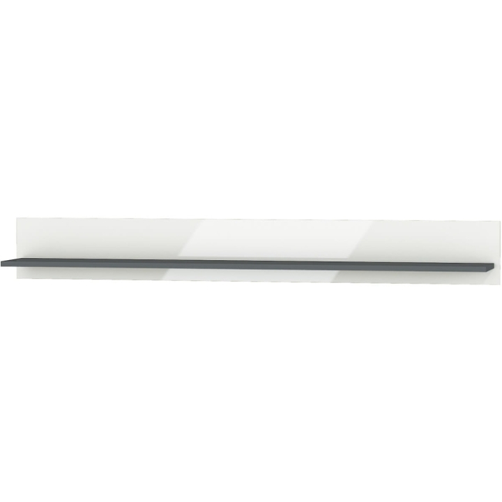 Półka ścienna WHP-2 bazuje na kontraście kolorystycznym. Konstrukcja składa się z płyty głównej w białym połysku, na której zamocowano mniejszą, antracytową półkę. To połączenie bieli z kontrastową wstawką podkreśla nowoczesny charakter mebla.