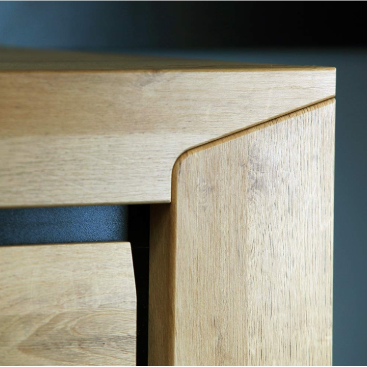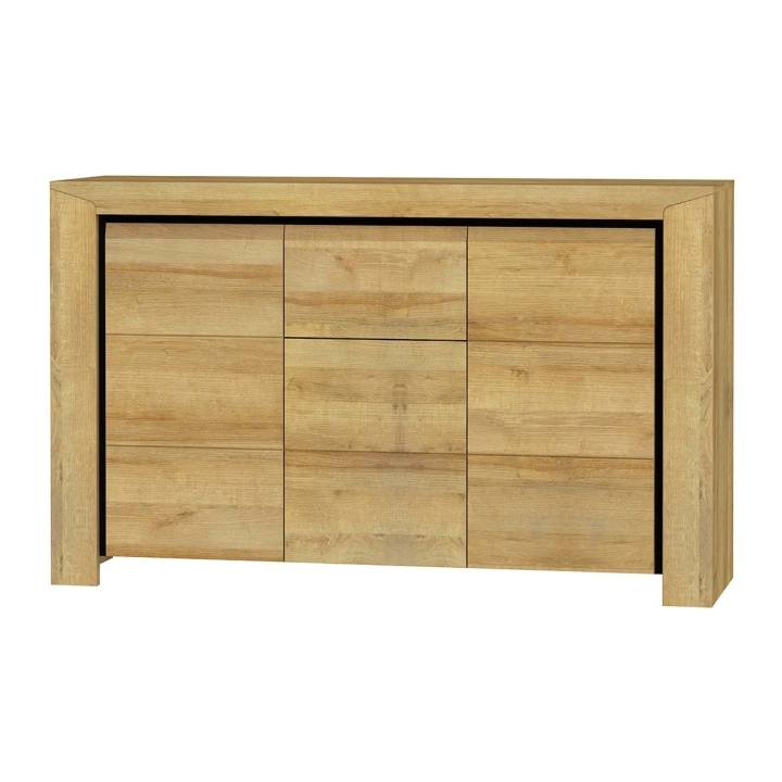 Komoda Sirocco SIK-1 producenta Restol to mebel o szerokości 152,4 cm, wysokości 93,6 cm i głębokości 43 cm. Kolekcja Sirocco wyróżnia się ciepłym i naturalnym kolorem Dębu Riviera z wyraźnie widocznym rysunkiem drewna. Charakterystyczne czarne wstawki stanowią kontrastujący akcent, który podkreśla nowoczesny charakter mebla.
