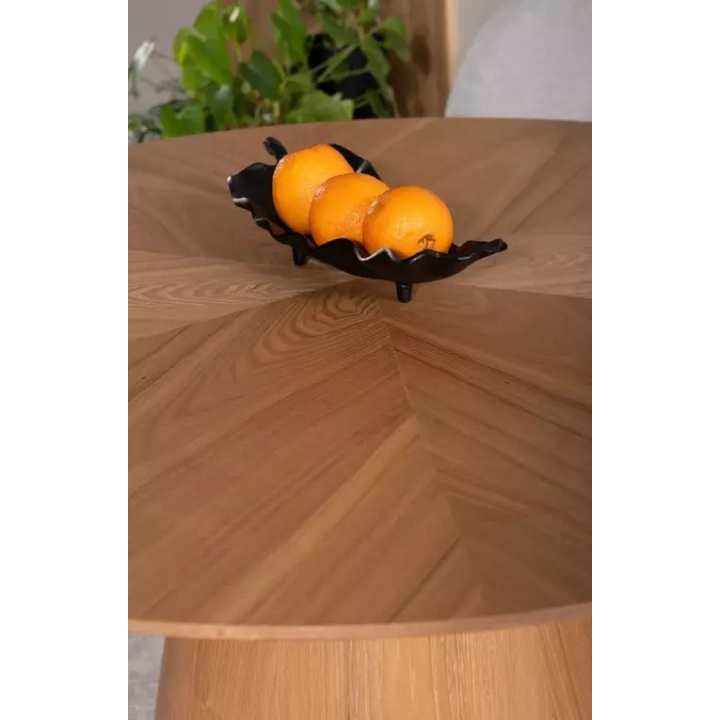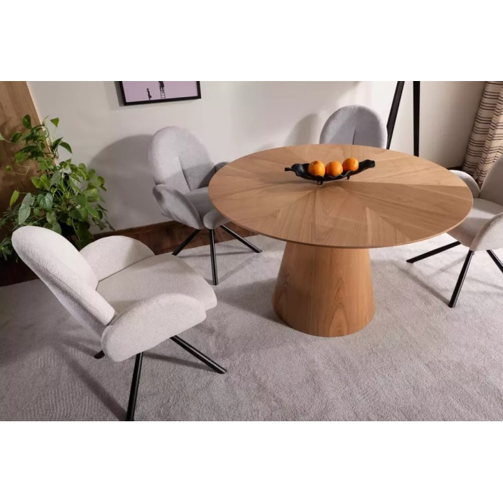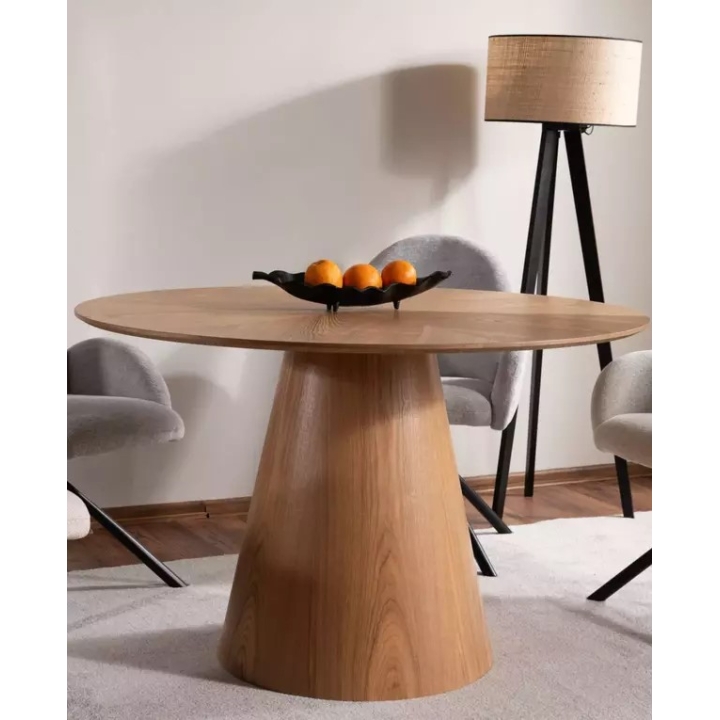 Okrągły kształt stołu o średnicy 120 cm sprzyja swobodnej komunikacji między uczestnikami spotkań. Wysokość 75 cm zapewnia wygodę podczas codziennego użytkowania i umożliwia komfortowe dopasowanie standardowych krzeseł. Konstrukcja nie jest rozkładana, dzięki czemu całość zachowuje jednolitą formę oraz nie wymaga dodatkowej regulacji.