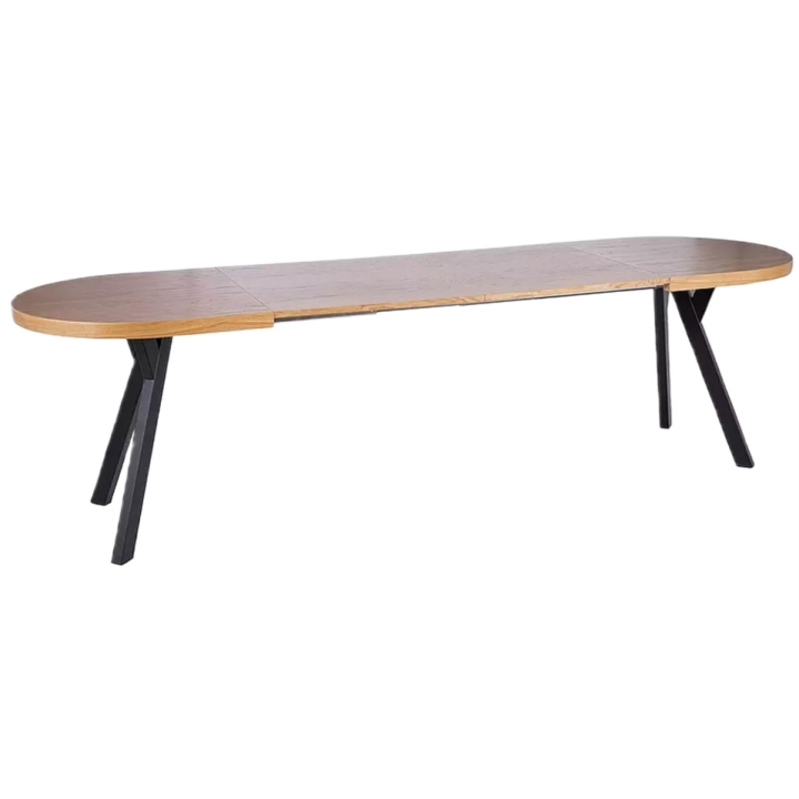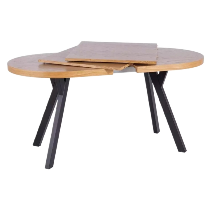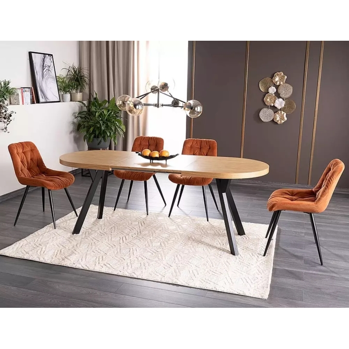 closeStół rozkładany Signal II producenta Signal to propozycja o wyraźnie wyprofilowanej formie, przeznaczona do jadalni, w której owalny blat staje się centralnym punktem aranżacji. Blat z płyty fornirowanej, zachwyca szlachetną barwą jasnego dębu. Osadzono go na metalowych, czarnych nogach, które tworzą wyrazisty kontrast dodający meblowi charakteru.