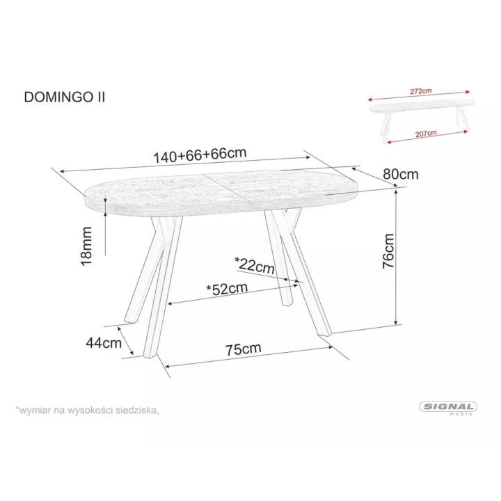 Podstawowe parametry obejmują wysokość 76 cm, a także blat o szerokości 140 cm i głębokości 80 cm, co nadaje konstrukcji wyważone proporcje. W komplecie znajdują się dwie dodatkowe części - wkładki, dzięki którym można zwiększyć szerokość blatu. Z jedną wkładką blat osiąga szerokość 206 cm, natomiast dwie zwiększają ją do 272 cm, pozwalając dopasować stół do większych spotkań.
