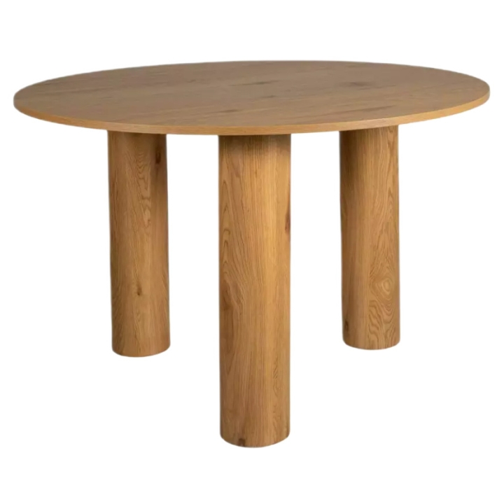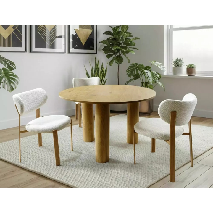 Stół Montana to mebel z okrągłym blatem o średnicy 120 cm i wysokości 76 cm, który wypełni przestrzeń jadalni lub większego salonu. Okrągły kształt blatu sprzyja swobodnej komunikacji przy wspólnym posiłku i pozwala na optymalne ustawienie krzeseł. Całość mebla została utrzymana w jasnej, dębowej kolorystyce, co wprowadza do wnętrza spokój i naturalny akcent.