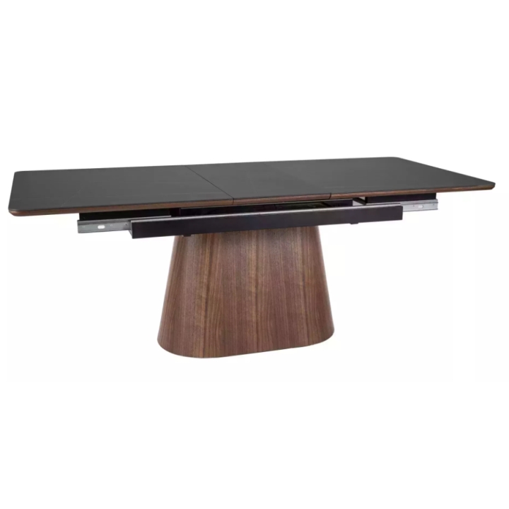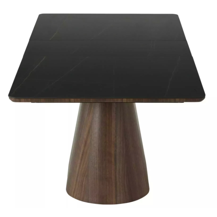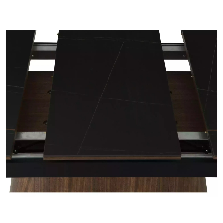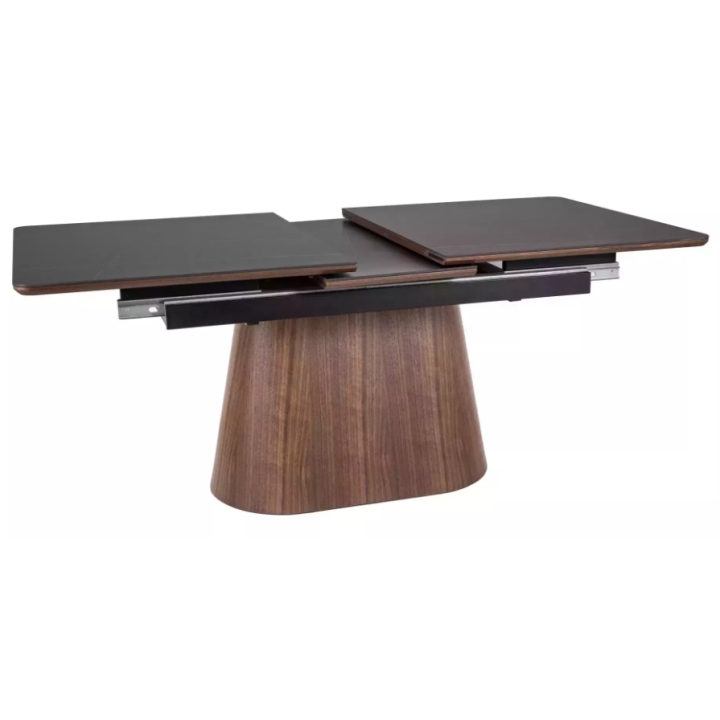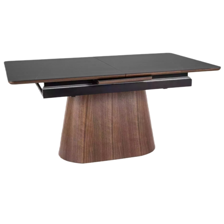 Wyjątkowy blat wykonany z ceramiki w czarnym odcieniu imitującym kamień stanowi wyrazistą bazę pod naczynia oraz dekoracje. Ceramiczna powierzchnia charakteryzuje się wysoką odpornością na codzienne użytkowanie, co ułatwia utrzymanie mebla w nienagannym stanie przez długi czas. Całość osadzona jest na centralnie osadzonej podstawie w głębokim odcieniu orzecha, wykonanej z płyty MDF i okleiny naturalnej. Ciemna kolorystyka podstawy idealnie koresponduje z czarnym blatem, tworząc spójną i wyrazistą kompozycję, która wnosi do wnętrza zdecydowany akcent.
