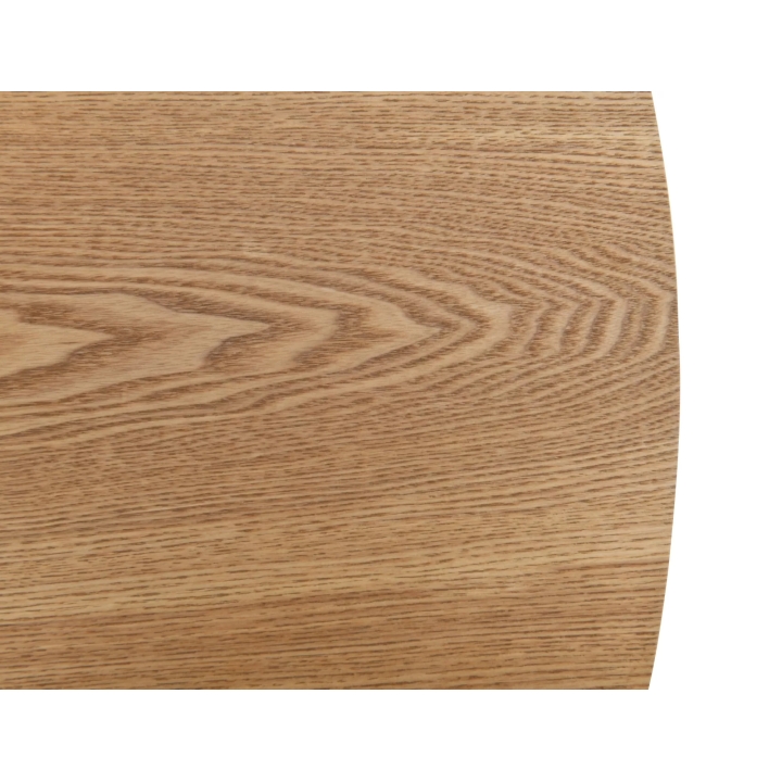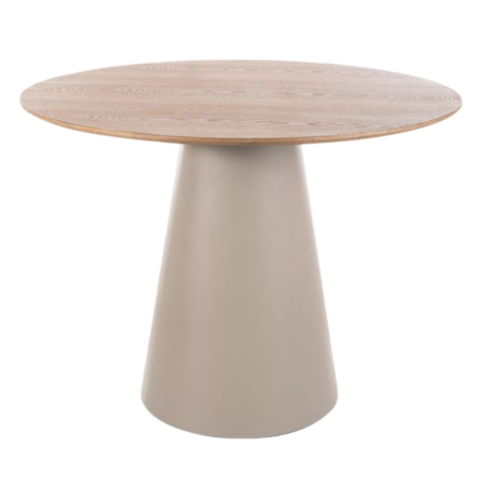 Blat mebla powstał z wytrzymałej płyty MDF wykończonej okleiną naturalną w odcieniu jasnego dębu. Jasna, dębowa góra płynnie łączy się z solidną, kolumnową podstawą wykonaną z lakierowanej płyty MDF w kolorze kaszmirowym. To subtelne zestawienie barw sprawia, że stół prezentuje się niezwykle lekko i nowocześnie, stanowiąc szlachetny akcent dekoracyjny, który nie przytłacza pomieszczenia.