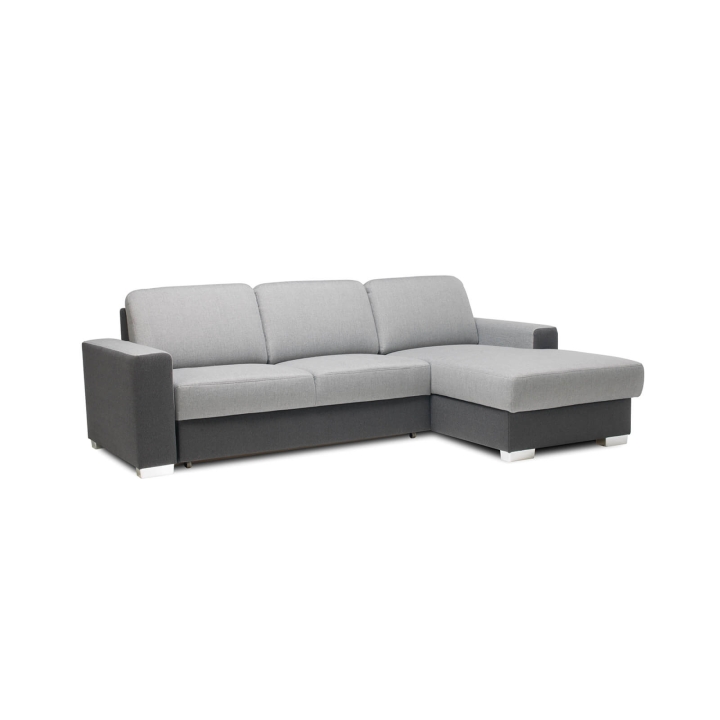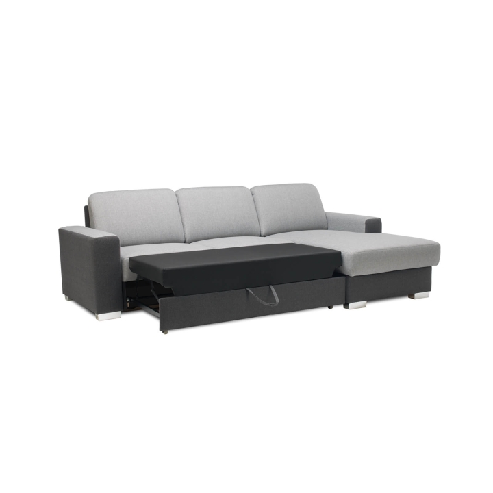 Narożnik został wyposażony w funkcję spania typu delfin, która umożliwia szybkie i bezproblemowe rozłożenie. Powierzchnia spania o wymiarach 193x128 cm sprawdzi się zarówno podczas okazjonalnego nocowania, jak i codziennego odpoczynku. W konstrukcji znajduje się pojemnik na pościel, w którym można przechowywać koce, poduszki czy pościel, co pozwala utrzymać porządek w salonie.