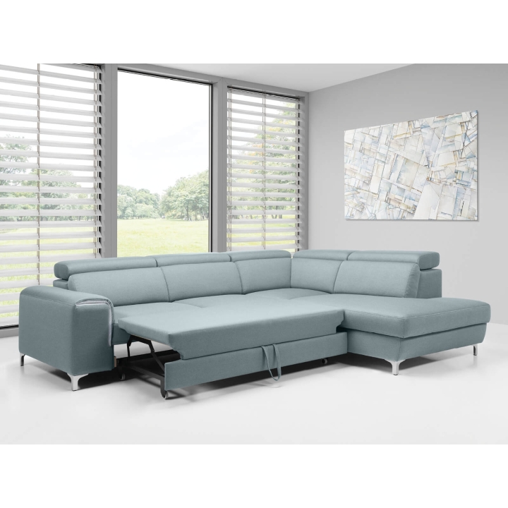 Model został wyposażony w funkcję spania typu puma, umożliwiającą szybkie i proste rozłożenie narożnika. Powierzchnia spania o wymiarach 210x136 cm sprawdzi się zarówno przy codziennym odpoczynku, jak i podczas noclegu gości. Dodatkowym udogodnieniem jest pojemnik na pościel, który pozwala przechowywać poduszki i koce, oszczędzając miejsce w salonie.