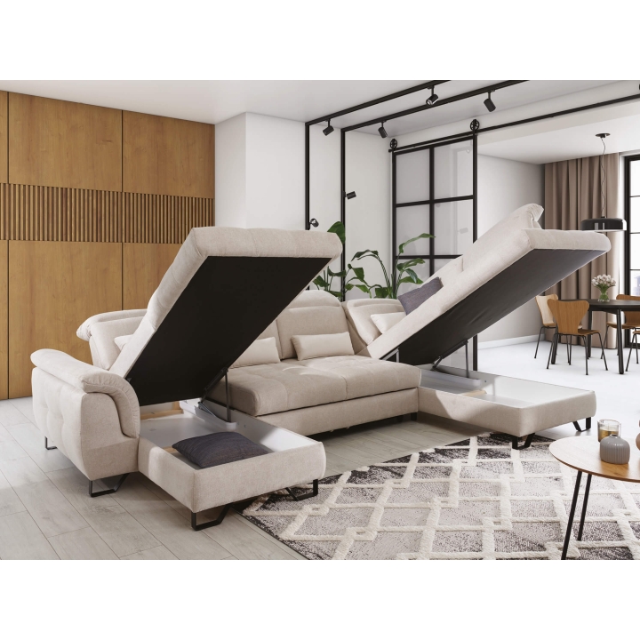 Giovani U łączy dużą powierzchnię, możliwość spania i dodatkowy schowek w jednej formie. Sprawdza się w pomieszczeniach, w których potrzebne jest obszerne miejsce do siedzenia i spania bez utraty przestrzeni użytkowej.