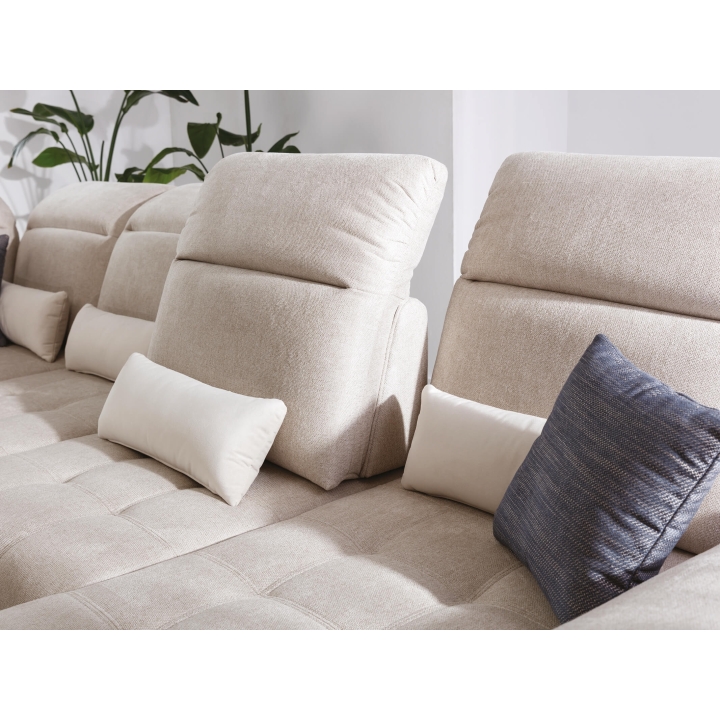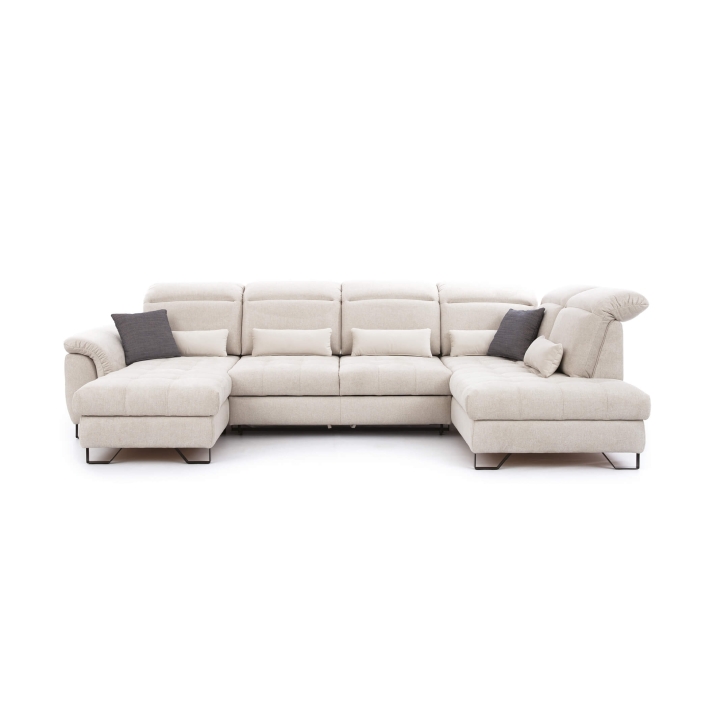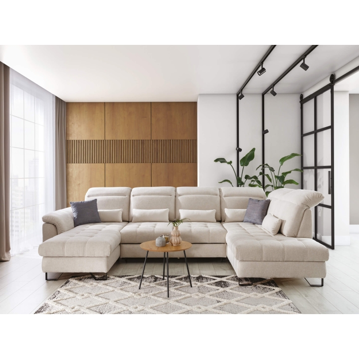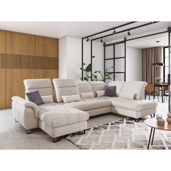 Narożnik Giovani U to model o rozbudowanej konstrukcji w kształcie litery U. Siedzisko i oparcie wypełniono pianką VP, która utrzymuje kształt i zapewnia stabilne podparcie podczas użytkowania. Materiał dobrze reaguje na nacisk i zachowuje swoje właściwości przez długi czas.