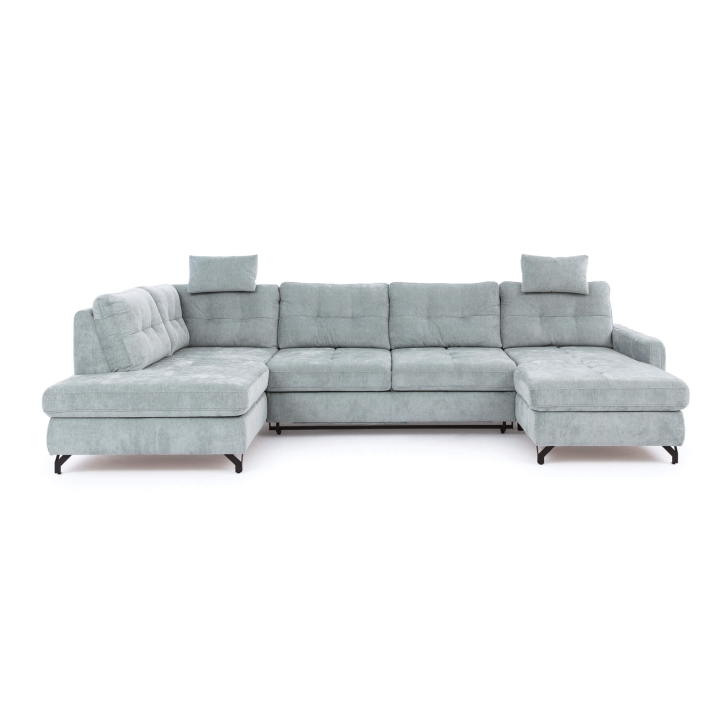 Narożnik Nawe U to model w układzie litery U z funkcją spania typu delfin i pojemnikiem na pościel. W siedzisku oraz oparciu zastosowano piankę VP, która utrzymuje kształt i zapewnia równomierne podparcie przy codziennym użytkowaniu.