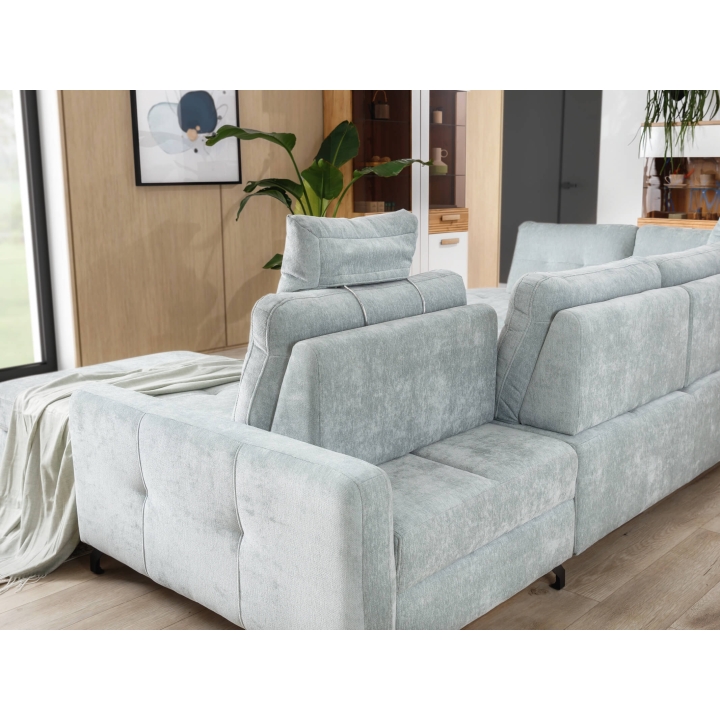Model posiada regulowane zagłówki, umożliwiające zmianę wysokości oparcia. Wymiary narożnika to 322 cm szerokości, 205 cm głębokości i 108 cm wysokości, co sprawia, że najlepiej sprawdza się w większych pomieszczeniach, tworząc przestrzeń do siedzenia i spania.