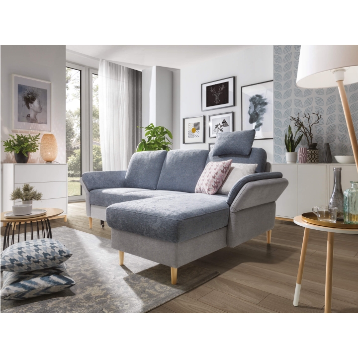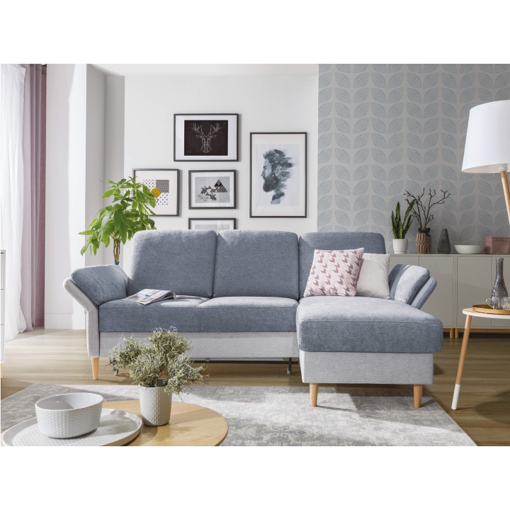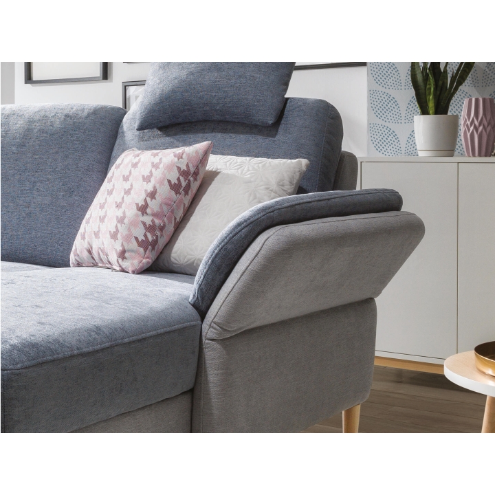 Narożnik Sori S to model z funkcją spania typu puma i pojemnikiem na pościel. W siedzisku oraz oparciu zastosowano piankę VP, która utrzymuje kształt i reaguje równomiernie na nacisk, co sprawdza się przy codziennym użytkowaniu.