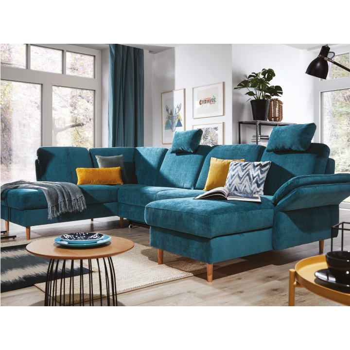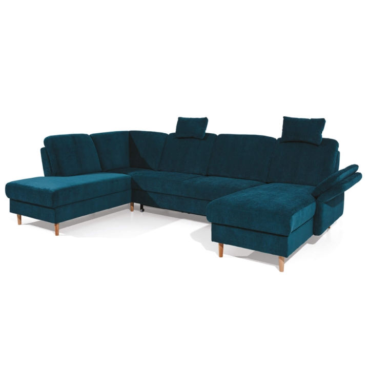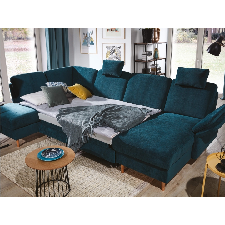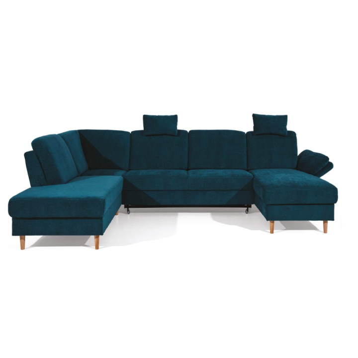 Narożnik Sori U to model o układzie litery U, wyposażony w funkcję spania typu puma i pojemnik na pościel. Siedzisko oraz oparcie wypełnione są pianką VP, która zachowuje pierwotny kształt i reaguje równomiernie na nacisk, co sprawdza się przy codziennym użytkowaniu.