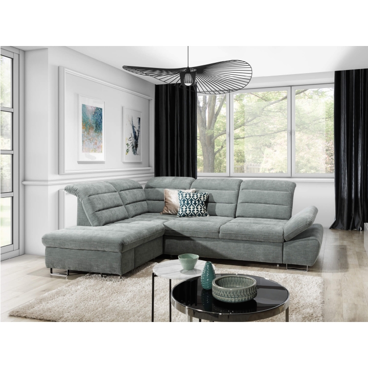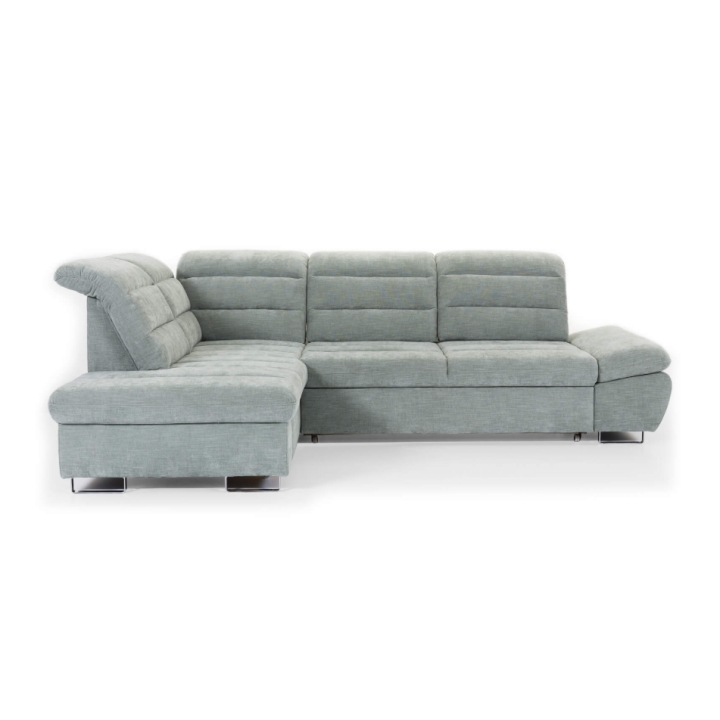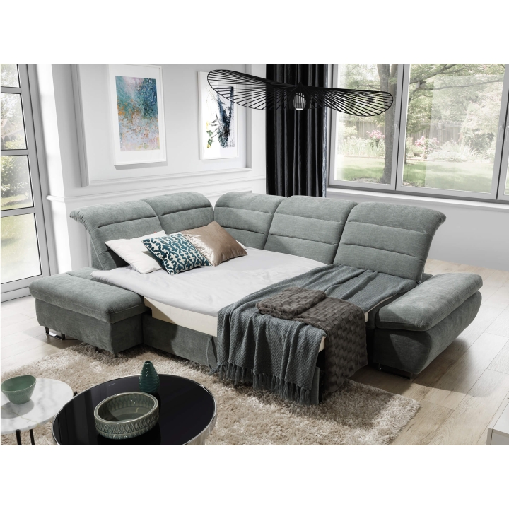 Roma L łączy mechanizm rozkładania, schowek i stabilną konstrukcję. Może pełnić funkcję narożnika dziennego oraz miejsca do spania w jednym układzie.