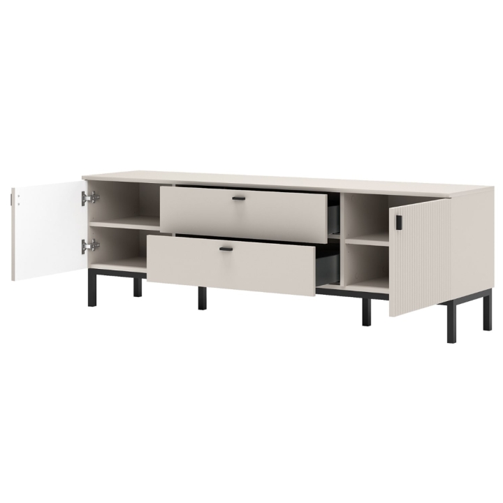 Mebel ma szerokość 167 cm, wysokość 54 cm i głębokość 40 cm, dzięki czemu doskonale sprawdzi się jako centralny punkt strefy telewizyjnej. Po bokach znajdują się drzwiczki, za którymi ukryto po jednej półce, tworząc przestrzeń na uporządkowane przechowywanie sprzętu lub akcesoriów RTV. Dwie centralne szuflady umożliwiają wygodne rozmieszczenie drobiazgów, zachowując porządek w salonie. Ryflowane fronty drzwiczek z pionowymi frezowaniami przyciągają uwagę ciekawą fakturą i nadają bryle głębi, podczas gdy gładkie fronty szuflad wprowadzają wizualny spokój i równowagę.