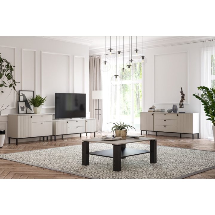 Szafka RTV Korfu 04 Szynaka Meble w kolorze kaszmirowym zachwyca subtelnym charakterem, który doskonale odnajduje się w nowoczesnych wnętrzach. Osadzona na wysokich czarnych nóżkach, z delikatnymi czarnymi uchwytami, tworzy wrażenie lekkości i nadaje pomieszczeniu naturalnego tonu.