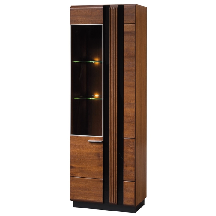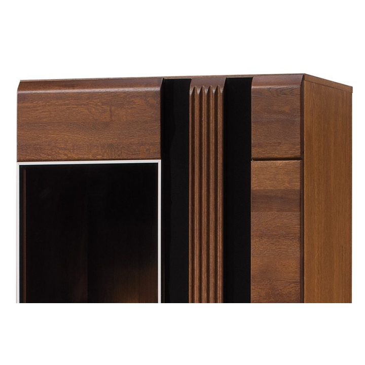 closeWitryna Porti 12 to nowoczesny mebel, który wyróżnia się dębem antycznym w połączeniu z czarnym hartowanym szkłem. Fronty witryny wykonane z litego drewna, a także ryflowane elementy ozdobne oraz metalowe uchwyty i ramki w kolorze szampańskim, nadają jej unikalnego charakteru. Witryna ma 2 przeszklone drzwi, które umożliwiają efektowną ekspozycję przedmiotów, a wewnątrz znajduje się 6 półek.