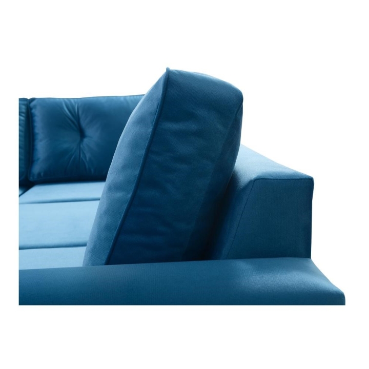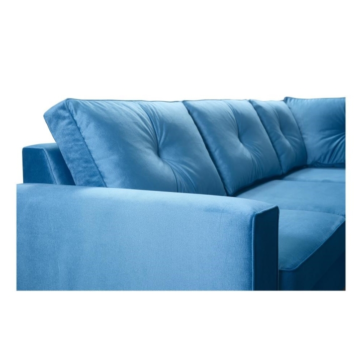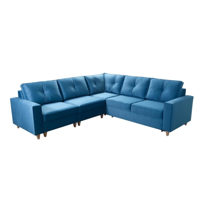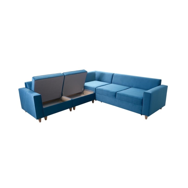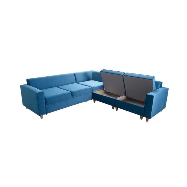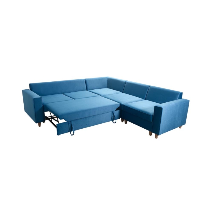 Narożnik wyposażono w mechanizm pozwalający na szybką i prostą transformację w strefę do spania o wymiarach 210x137 cm. Podwyższony poziom organizacji przestrzeni umożliwia obecność dwóch pojemników na pościel, co jest istotnym udogodnieniem. W zestawie zawarte są również poduszki widoczne na zdjęciu, jednakże producent nie przewiduje możliwości wykonania ich z zamkiem błyskawicznym.