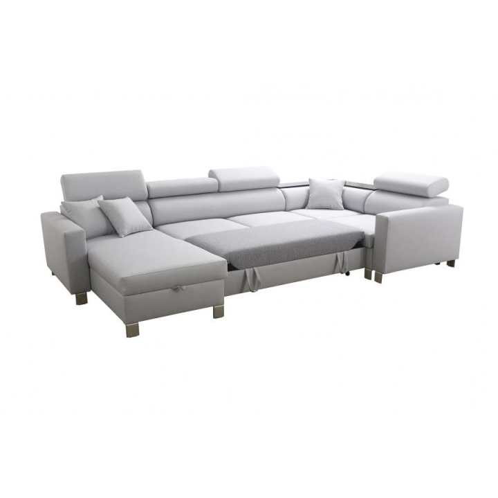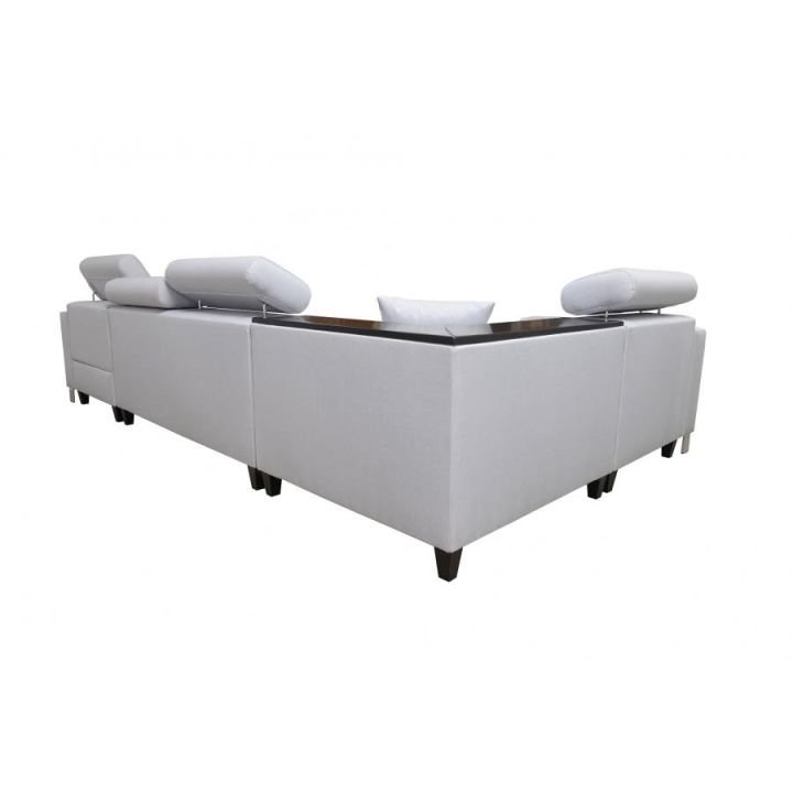 Użytkownicy docenią rozbudowane wyposażenie tego modelu, zwiększające jego użyteczność. Loretti V wyposażony jest w 4 regulowane zagłówki, które umożliwiają indywidualne dopasowanie kąta podparcia głowy. Dodatkowym atutem są dwa pojemniki na pościel, oferujące znaczną przestrzeń do przechowywania tekstyliów domowych. Narożnik posiada również wbudowaną półkę w rogu, stanowiącą miejsce na drobiazgi lub dekoracje.