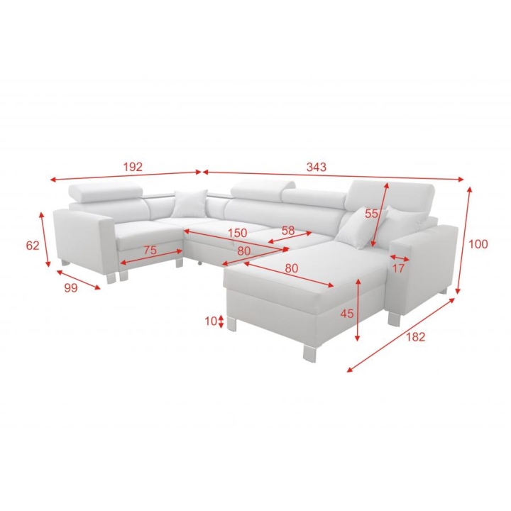 Narożnik Loretti V Umebluje, który stanowi obszerne i przemyślane centrum wypoczynkowe dla współczesnych wnętrz. Jego szerokość całkowita wynosi 343 cm, a głębokość dłuższego boku to 192 cm, natomiast krótszego boku 182 cm. Mebel ten osiąga wysokość 100 cm, gwarantując imponujący wygląd oraz komfort.
