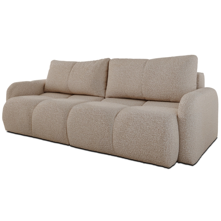 Mechanizm spania typu DL umożliwia sprawne przekształcenie sofy w pełnowymiarowe miejsce do nocnego odpoczynku. System polega na wysunięciu siedziska do przodu i złożeniu oparcia na powstałej powierzchni, co tworzy równą przestrzeń do spania o wymiarach 142x200 cm. Rozkładanie odbywa się płynnie i nie wymaga dużego wysiłku, co czyni tę funkcję odpowiednią nawet przy codziennym użytkowaniu. Dodatkowym atutem jest pojemnik na pościel ukryty w konstrukcji, który ułatwia przechowywanie kołdry, poduszek czy koca.
