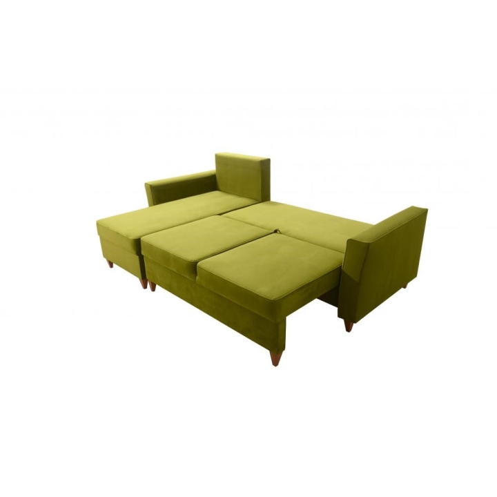Model wyposażono w 2 pojemniki na pościel, co znacząco zwiększa możliwości organizacyjne przestrzeni. Narożnik oferuje funkcję spania delfin, a rozkładana powierzchnia o wymiarach 205×132 cm tworzy solidne miejsce do wypoczynku nocnego. Konstrukcja opiera się na sprężynach falistych oraz utwardzonej piance T-30, co podnosi trwałość oraz stabilność mebla.