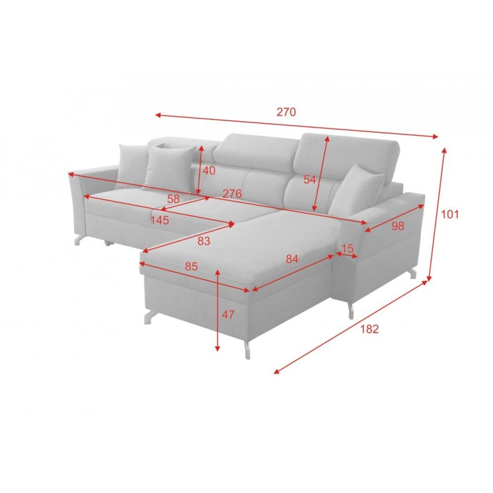 Przemyślane parametry konstrukcyjne, takie jak szerokość 270 cm, głębokość 182 cm, wysokość 101 cm, a także krótszy bok 98 cm i dłuższy bok 182 cm, pozwalają na wygodne zagospodarowanie przestrzeni. Narożnik wyposażono w powierzchnię spania 210 × 127 cm, której rozkładanie ułatwia mechanizm FUNKCJA SPANIA DELFIN. Komfort podnosi również wysokość siedziska 47 cm, zapewniająca swobodne wstawanie.